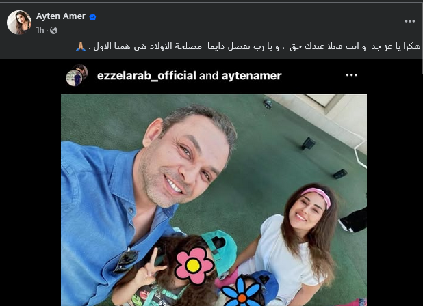 وأعادت أيتن عامر، مشاركة منشور طليقها محمد عز العرب، عبر حسابها الرسمي بموقع التواصل الاجتماعي فيس بوك، وعلقت قائلًا: شكرا يا عز جدًا، أنت فعلًا عندك حق ويارب تفضل دايمًا مصلحة الأولاد هى همنا الأول .