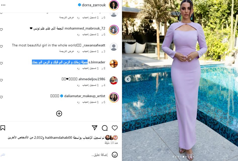أنهالت التعليقات الإيجابية على أحدث إطلالات النجمة التونسية درة زروق بعدما شاركت متابعيها أحدث إطلالاتها عبر حسابها الشخصي بموقع الإنستجرام، وجاءت أغلبها مؤيدة لذوقها الراقي، رصدنا أبرزها: " جميلة زمانك و الزمن الي قبلك و الزمن الي بعدك، فخامة، ملكة الأناقة".