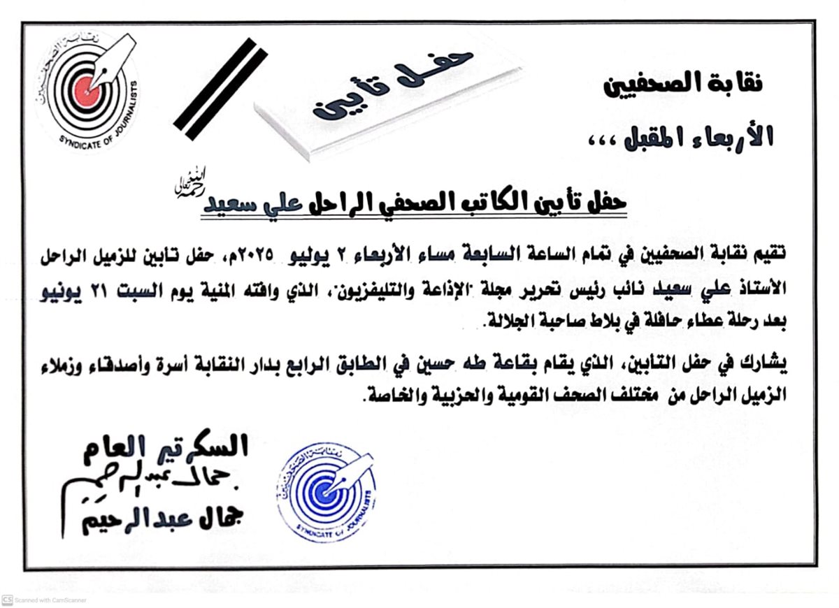 تقيم نقابة الصحفيين في تمام الساعة السابعة مساء الأربعاء 2 يوليو 2025م، حفل تأبين للزميل الراحل الأستاذ علي سعيد نائب رئيس تحرير مجلة "الإذاعة والتليفزيون"، الذي وافته المنية يوم السبت 21 يونيو بعد رحلة عطاء حافلة في بلاط صاحبة الجلالة.