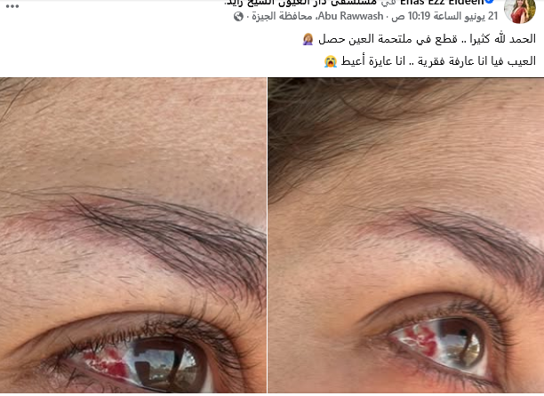 وأردفت قائلة:"ادعولي تعدي على خير وربنا يقويني لأن فعلاً مش قادرة أوصف الحالة اللي أنا فيها، وكل ده بسبب خطأ طبي ومتابعة خاطئة كمان وتثبيت من الدكتورة وفي المتابعة تقولي عينك زي الفل وبتتحسن والجرح قفل، وهي تتدهور يوم بعد يوم من مشكلة بسيطة بشهادة كل الدكاترة، يدوب محتاجة قطرة ومضاد حيوي ويومين راحة وابقى زي الفل لجرح وصل لـ ٤ مل ولعملية وتليف في جزء من الملتحمة وقص وخياطة وليلة كبيرة بلا داعي".