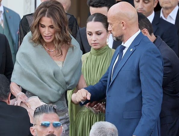 وشاركت الأميرة إيمان، ابنة الملكة رانيا، والدتها حضور حفل الزفاف الفاخر، حيث ظهرت بفستان شيفون أخضر مصمم خصيصًا لها من دار أوسكار دي لا رينتا، مع تسريحة شعر أنيقة على شكل كعكة مشدودة وأقراط ذهبية سبق أن ارتدتها والدتها، في إطلالة شبابية أنيقة وراقية.