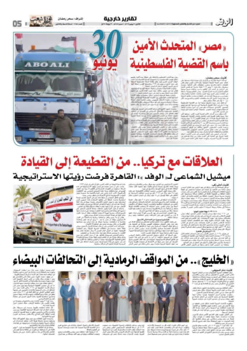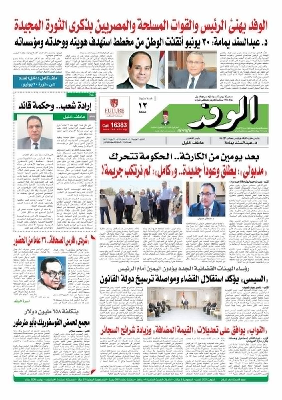 تنشر جريدة الوفد في عددها الصادر، غدًا الإثنين، العديد من الموضوعات والتقارير الإخبارية المهمة، أبرزها: “الوفد يهنيء الرئيس والقوات المسلحة والمصريين بذكرى الثورة المجيدة”