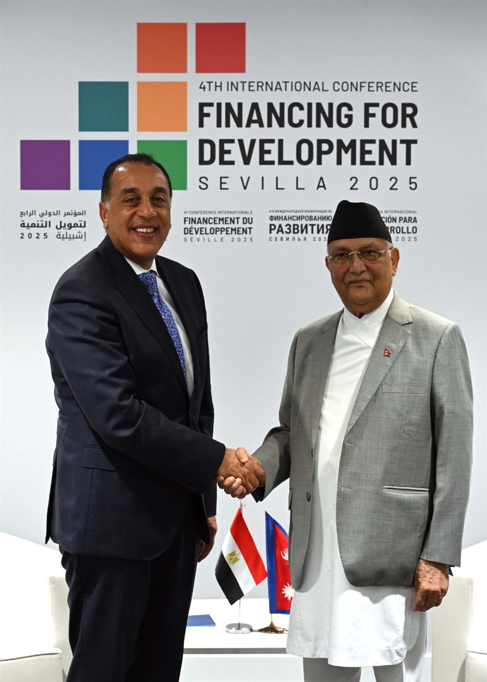 التقى الدكتور مصطفى مدبولي، رئيس مجلس الوزراء، كي بي شارما أولي، رئيس وزراء نيبال، على هامش مشاركته، نيابة عن الرئيس عبدالفتاح السيسي، رئيس الجمهورية، في مؤتمر الأمم المتحدة الرابع لتمويل التنمية، الذي تستضيفه مقاطعة إشبيلية الإسبانية، وذلك بحضور السفير إيهاب بدوي، سفير مصر لدى إسبانيا.