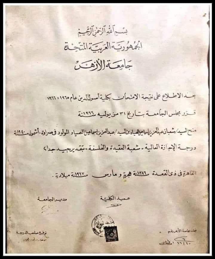 حصل فضيلة المغفور له الشيخ شعبان عبدالعزيز الصياد على درجة العالمية من كلية أصول الدين شعبة العقيدة والفلسفة من جامعة الأزهر في مارس 1967 بدرجة "جيد جدا" وهو ما أهله بعد تخرجه للعمل بهيئة التدريس آنذاك، وقال رحمة الله عليه في مذكراته "إن نداء القرآن كان أقوى من نداء التدريس بالنسبه له" و"إنه كان منذ طفولته يعشق الاستماع للقرآن وتدبر معانيه وتفسيره حتى أتم حفظه وهو في السابعة".