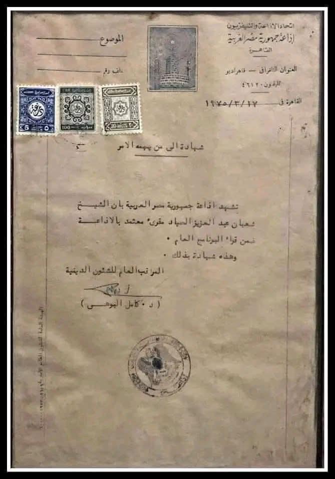 ويضيف "كان رحمه الله يحرص كل ثلاثة أسابيع على تلاوة قرآن الفجر في مسجد مختلف على امتداد الوطن في مصر، ثم اشتهر بتلاوة القرآن في افتتاح الإرسال التلفزيوني المصري (التلفزيون العربي) آنذاك وكان ذلك تقليدا متبعا في حينه حتى صار أحد أعمدة التلاوة وهو في عمر صغير جنبا إلى جنب مع أساطير التلاوة الشيخ محمد عبدالباسط عبدالصمد والشيخ محمود خليل الحصري وقد شهدوا له بالجمع بين العلم الشرعي وعذوبة الصوت".
