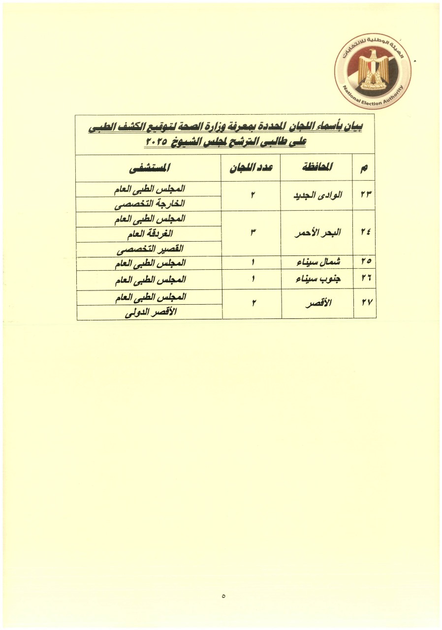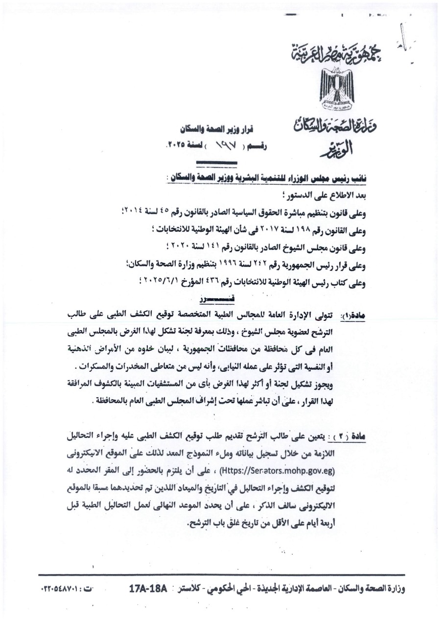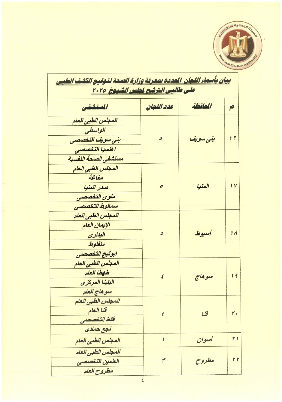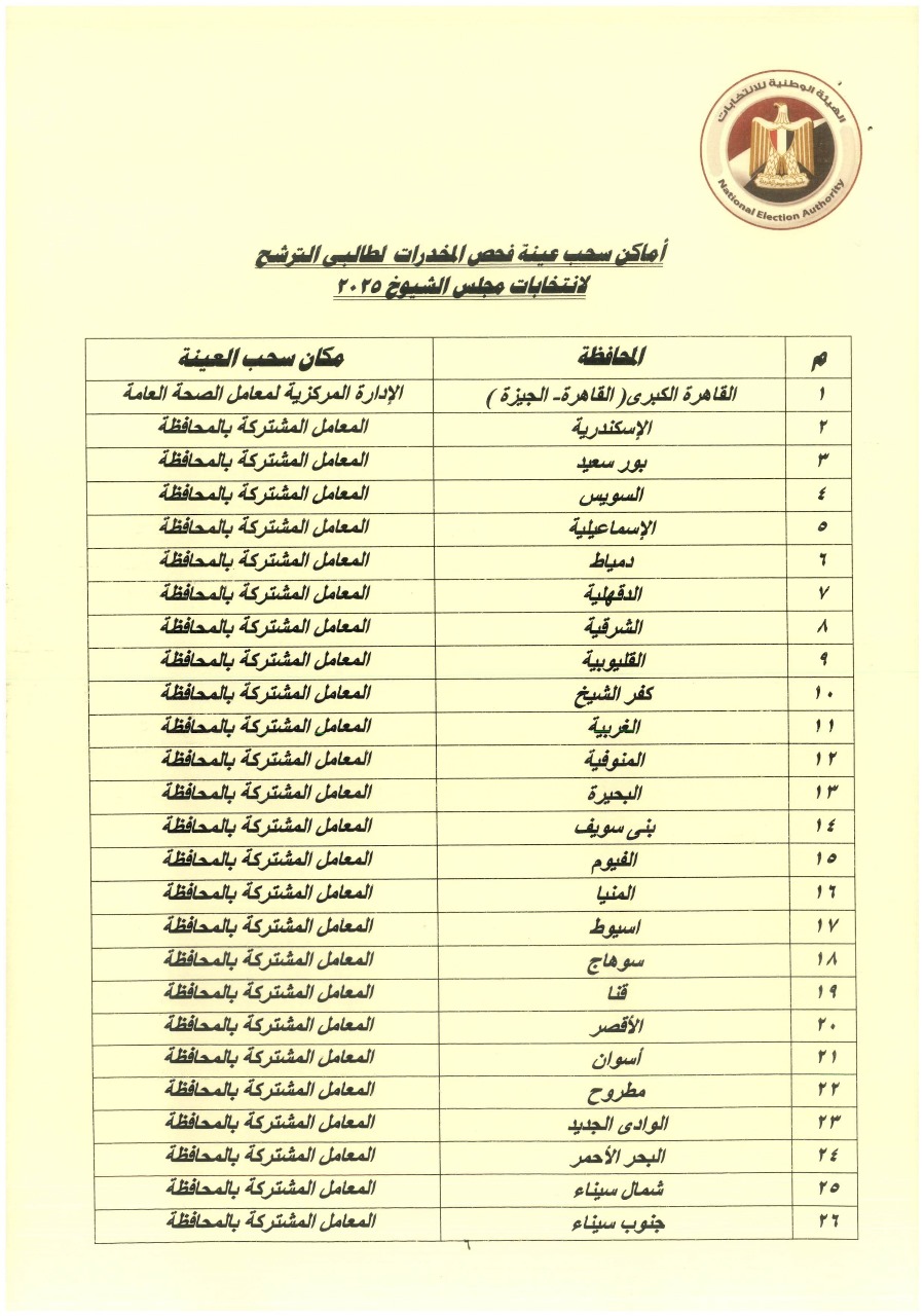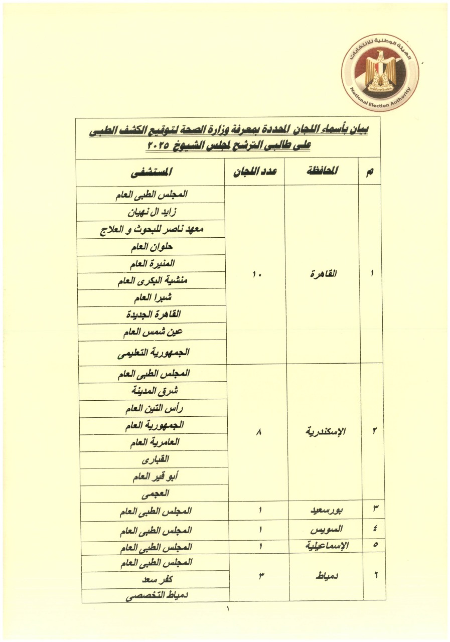 أماكن اللجان الطبية ومعامل توقيع الكشف الطبي للراغبين في الترشح بانتخابات الشيوخ