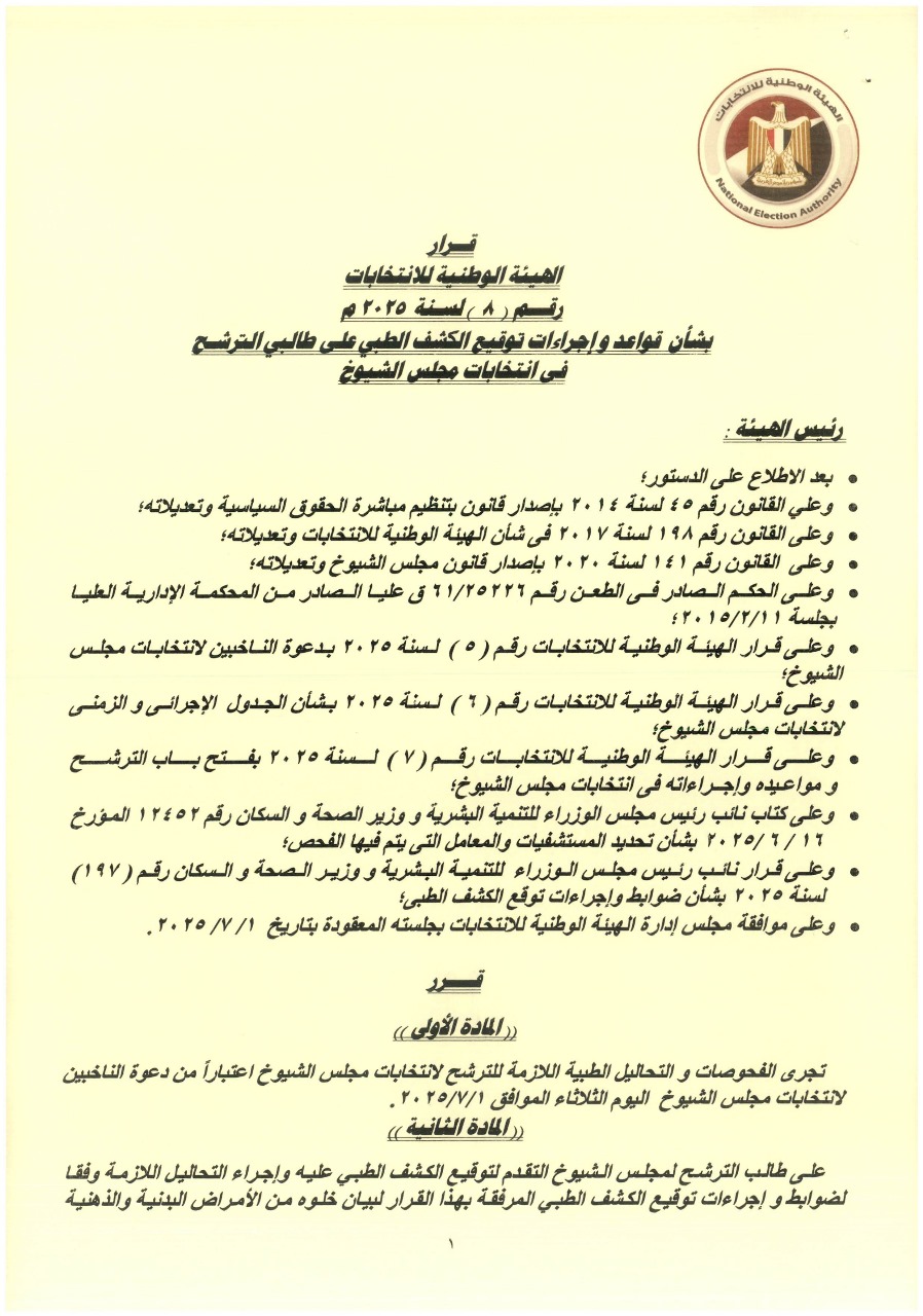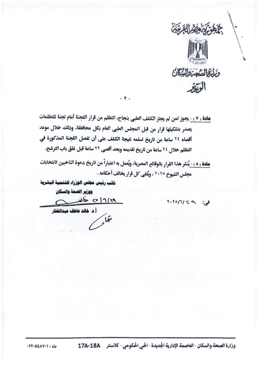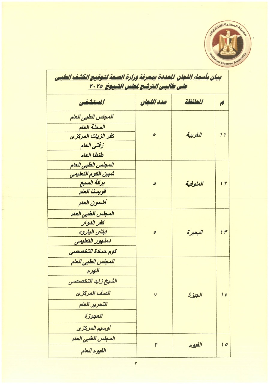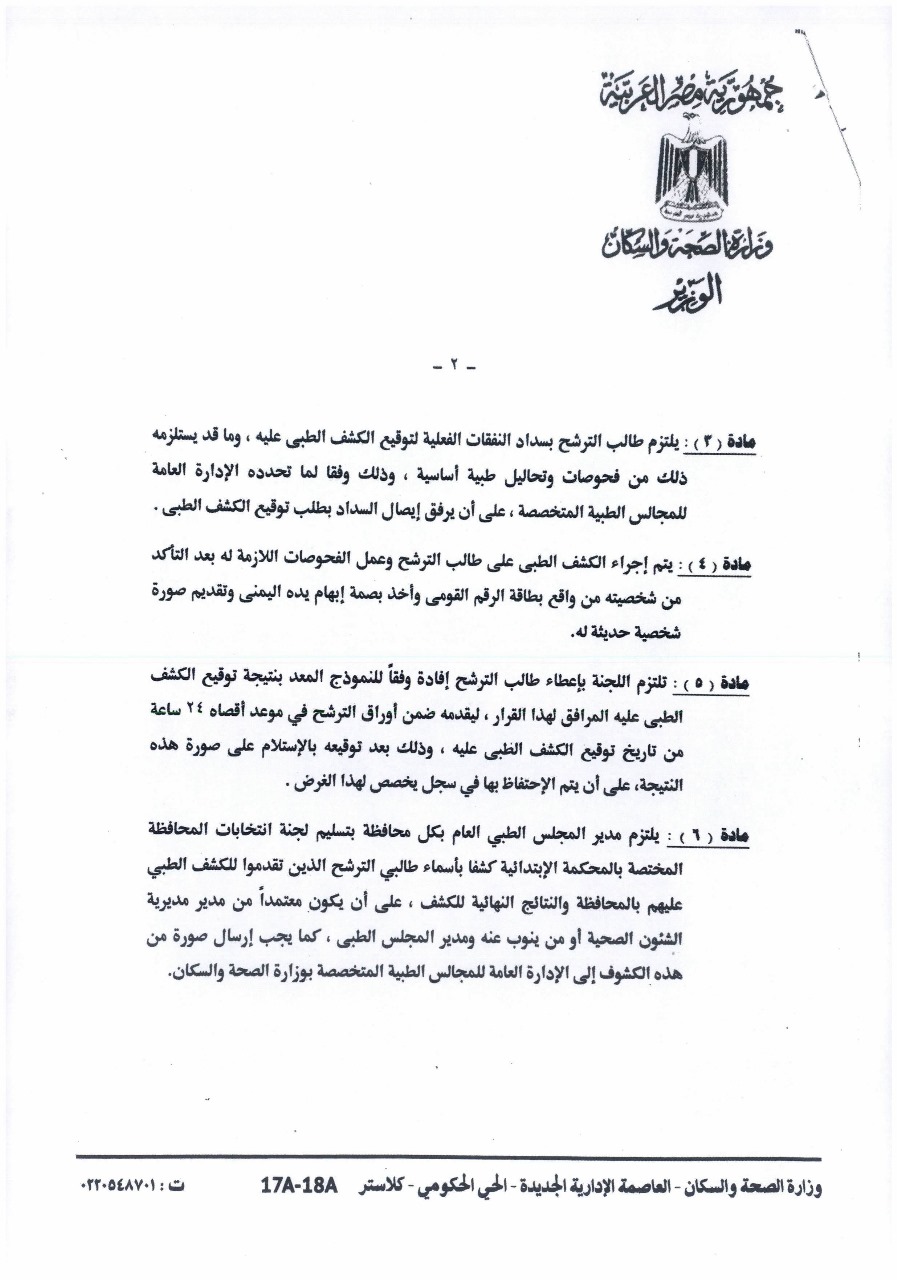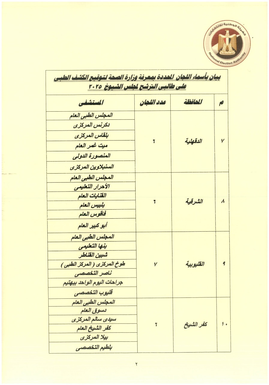 أماكن اللجان الطبية ومعامل توقيع الكشف الطبي للراغبين في الترشح بانتخابات الشيوخ