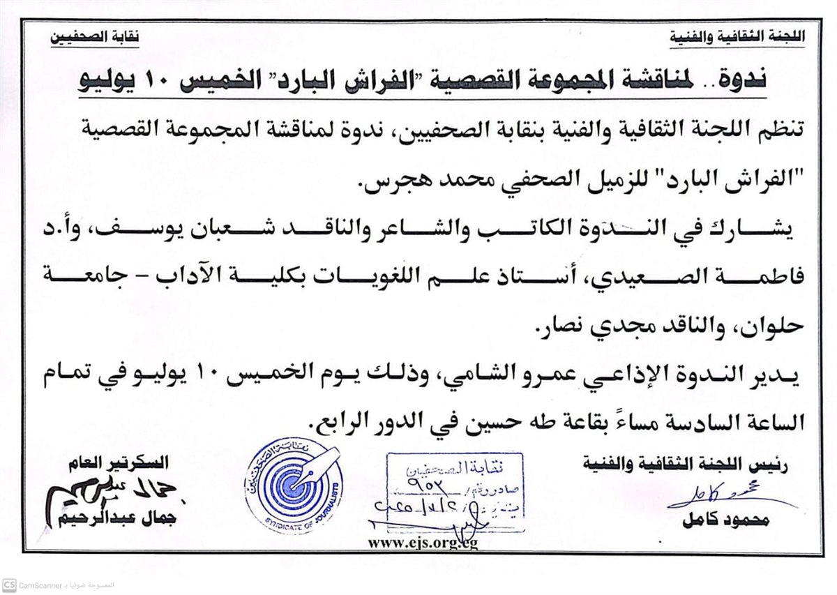 تنظم اللجنة الثقافية والفنية بنقابة الصحفيين، ندوة لمناقشة المجموعة القصصية "الفراش البارد" للزميل الصحفي محمد هجرس.