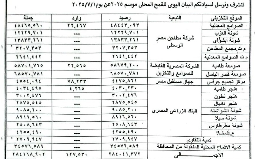 وكانت صوامع الغلال قد بدأت استلام محصول القمح من المزارعين منذ بداية شهر أبريل الماضي، بعدد من الشون والصوامع والهناجر المجهزة لاستقبال المحصول بالقرى والمراكز.