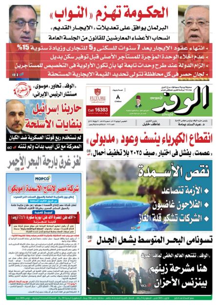 تنشر جريدة الوفد في عددها الصادر غدًا الخميس، العديد من الموضوعات والتقارير الإخبارية المهمة، ابرزها : الحكومة تهزم "النواب".