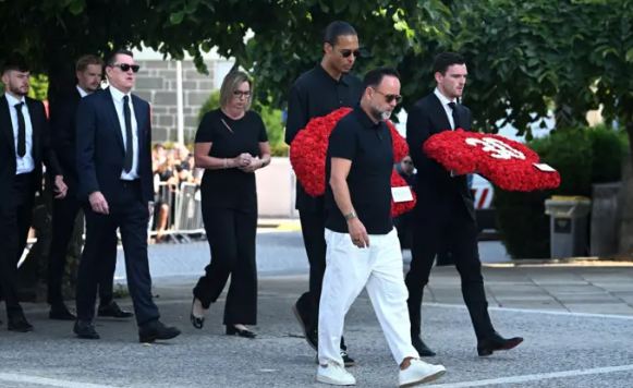 وتقدم لاعبي ليفربول الحاضرين لجناز ديوجو جوتا قائد الفريق فيرجيل فان دايك وأندي روبرتسون بجانب المدير الفني آرني سلوت وهم يحملون إكليلاً من الزهور يحمل الرقم 20 (رقم قميص ديوجو جوتا).