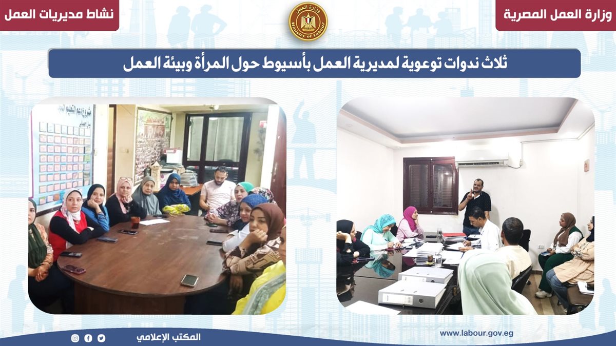 نظمت مديرية العمل بأسيوط، 3 ندوات توعوية من خلال مكتب عمل شرق أسيوط، وذلك في إطار تنفيذ توجيهات محمد جبران وزير العمل، بضرورة نشر التوعية القانونية داخل بيئة العمل وخاصة في قضايا المرأة.