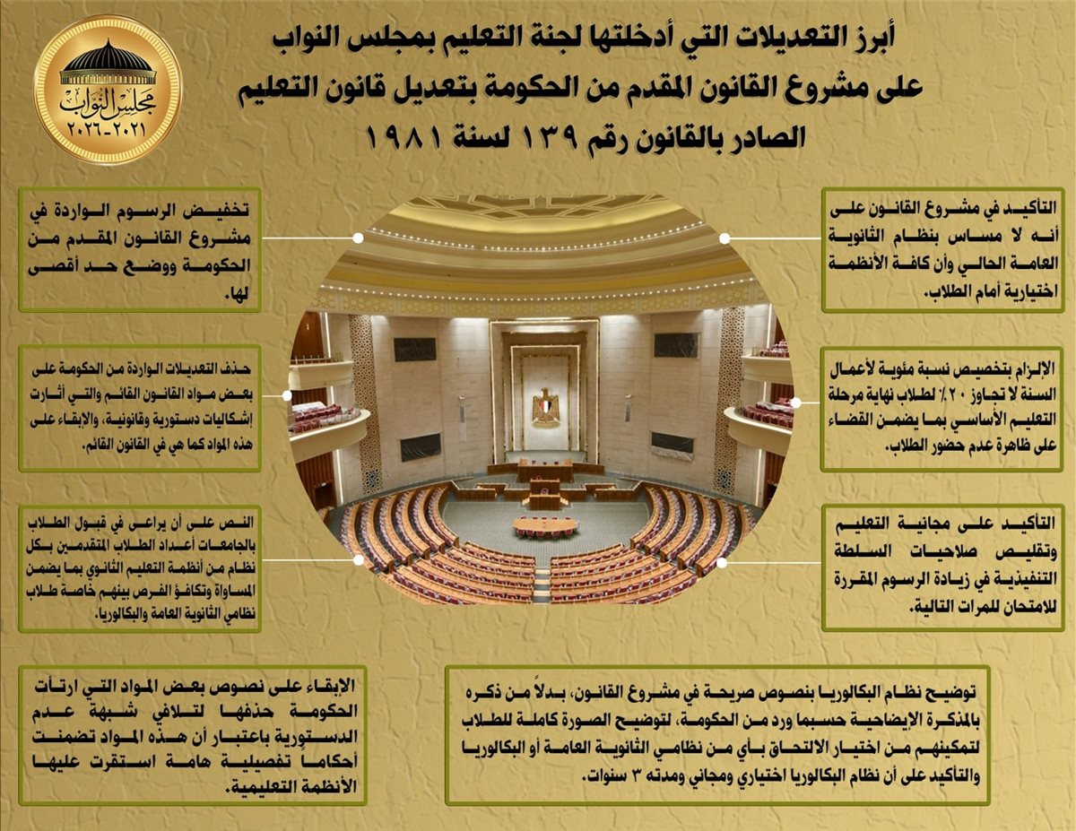يناقش مجلس النواب اليوم تعديلات قانون التعليم وجاءت أبرز التعديلات التي أدخلتها لجنة التعليم بمجلس النواب على مشروع القانون المقدم من الحكومة بتعديل قانون التعليم الصادر بالقانون رقم ١٣٩ لسنة ١٩٨١.