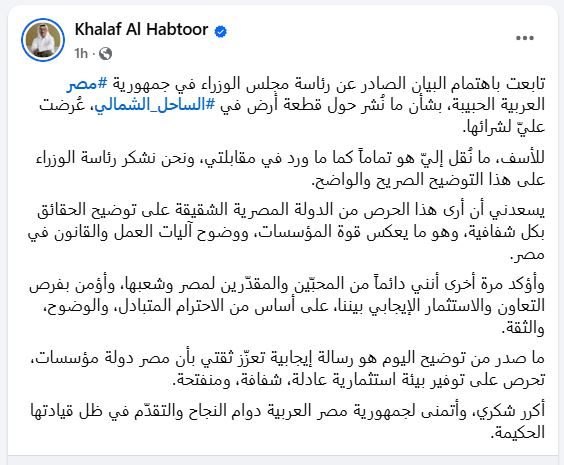 أنهى رجل الأعمال الإماراتي خلف الحبتور حالة الجدل التي أثيرت حول قطعة أرض فى الساحل الشمالي، بعدما انتشرت شائعات تدخل بعض المسئولين لرفع سعرها، وهو ما نفاه الحبتور في بيان على صفحة الرسمية بموقع "فيسبوك" جملة وتفصيلاً فى منشور له مساء اليوم، وذلك ردًا على ما أدلى به المتحدث الرسمي لمجلس الوزراء المصري المستشار محمد الحمصاني الذى نفى فية ما ردده الحبتور من تدخل رئيس الوزراء في زياده سعر قطعة أرض كان يعتزم شرائها والساحل الشمالي.
