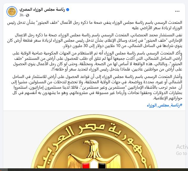 وكان المستشار محمد الحمصاني، المتحدث الرسمي باسم رئاسة مجلس الوزراء، قد نفى فى بيان صحة ما ذكره رجل الاعمال الإماراتي "خلف الحبتور" في إحدى وسائل الإعلام، بشأن تدخل رئيس مجلس الوزراء لزيادة سعر قطعة أرض كان ينوي شراءها في الساحل الشمالي، من 10 ملايين دولار إلى 30 مليون دولار.