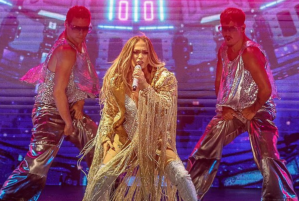 كما أضافت سترة ذهبية مزينة بشراشيب منحت إطلالتها مزيدًا من التوهج المسرحي. وتمايلت جينيفر بخفة وأناقة، مظهرة مهاراتها في الرقص التي لا تزال تخطف الأنفاس رغم مرور أكثر من عقدين على انطلاقتها في عالم الاستعراض.