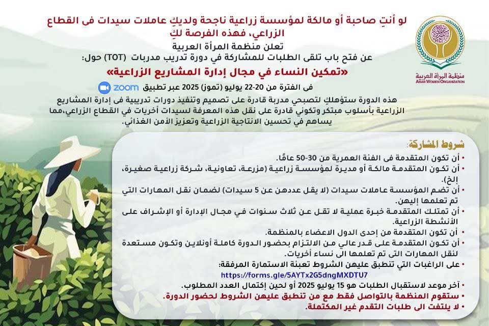 "تمكين النساء في مجال إدارة المشاريع الزراعية"، والتي تُعقد عبر تطبيق "زووم" خلال الفترة من 20 إلى 22 يوليو 2025.
