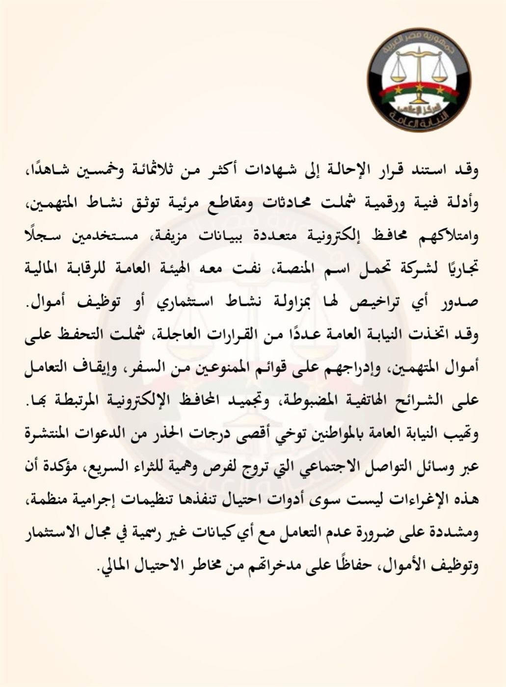 وتهيب النيابة العامة بالمواطنين توخي أقصى درجات الحذر من الدعوات المنتشرة عبر وسائل التواصل الاجتماعي التي تروج لفرص وهمية للثراء السريع، مؤكدة أن هذه الإغراءات ليست سوى أدوات احتيال تنفذها تنظيمات إجرامية منظمة، ومشددة على ضرورة عدم التعامل مع أي كيانات غير رسمية في مجال الاستثمار وتوظيف الأموال، حفاظًا على مدخراتهم من مخاطر الاحتيال المالي.