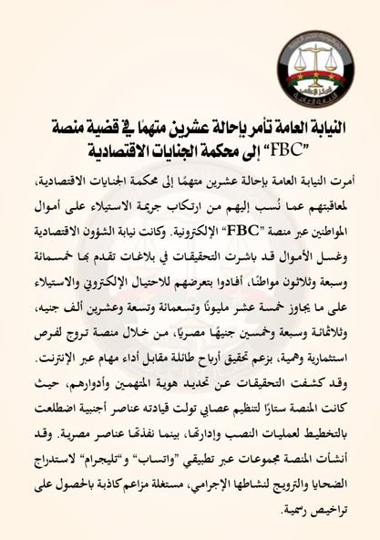أمرت النيابة العامة بإحالة عشرين متهمًا إلى محكمة الجنايات الاقتصادية، لمعاقبتهم عما نُسب إليهم من ارتكاب جريمة الاستيلاء على أموال المواطنين عبر منصة “FBC” الإلكترونية.