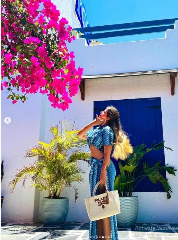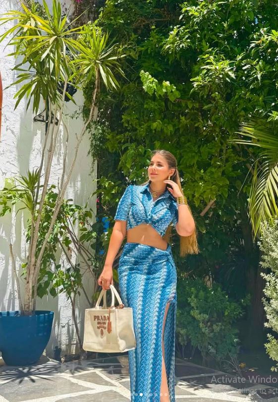 وبدت ملك قورة بإطلالة صيفية تميل للجرأة، مرتدية كاش مايوه مكشوف البطن واتسم بشق مثير كشف عن أحد ساقيها صمم من قماش اللاميه باللون الأزرق الفاتح.