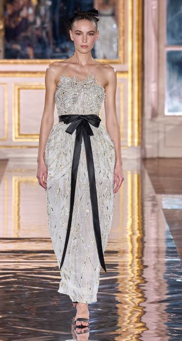استوحى زهير مراد مجموعته لربيع وصيف 2025 من الغابات الاستوائية، فنفذ التطريز على شكل الورود وأوراق الشجر، وبخلاف الفساتين الملونة التي طغت على منصة العرض، أدرج المبدع اللبناني فساتين بيضاء مشغولة بتطريز فضي ظهر على الشيفون، وكأنه لوحة فنية رسمها فنان تشكيلي، فوقعنا في عشق الفستان الديكولتيه الذي تلامس حافته بالكاد الكاحل خاصة أنه زود بحزام أسود عريض معقود من الأمام على شكل فيونكة زادته جمالاً.