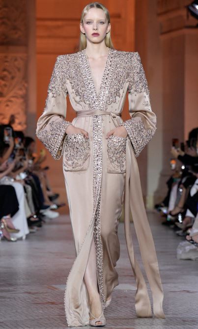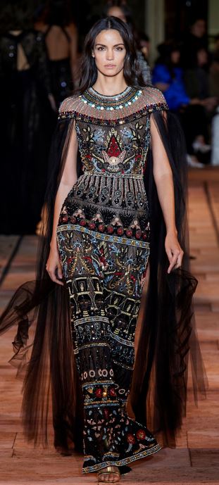 تملك الحضارة المصرية القديمة من السحر والإلهام ما يجبر مصممي الأزياء حول العالم أن يستوحوا منها، فهي المرجع الأصلي لكل ما نراه على منصات العروض العالمية في يومنا هذا، ولكن مجموعة زهير مراد التي أطلقها في يناير 2020 لموسم الربيع والصيف لم تكن مجرد تصاميم ذكرتنا بأزياء الملكات المصريات بل تكريم لحضارة عريقة من مصمم يملك أدواته ويحمل حباً كبيراً يربطه بأصوله العربية، ولو حاولنا أن نشير إلى التصاميم التي لفتتنا في تلك المجموعة؛ فسنختار كل الإطلالات التي ظهرت على منصة العرض، لذا سنكتفي بهذا الفستان الأيقوني الساحر المزين بتطريزات عالية الدقة تأتي على شكل القلادات العريضة التي ارتبطت بإطلالات الملكات في عهد الأسرة الرابعة، ولمزيد من الفخامة زود بكاب منبثق عن الكتفين.