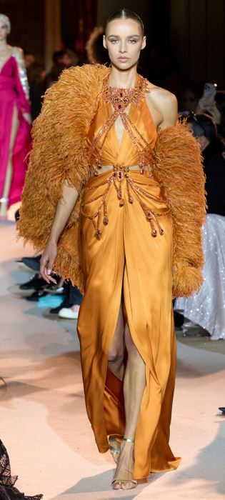 تعد فساتين السهرة المصممة بفتحات على جانبي الخصر Cut Out Dresses من أبرز سمات مجموعات زهير مراد الأخيرة، وللحق أنه من أكثر المصممين البارعين في تنفيذها، فلا يمكن أن ننسى إطلالة عارضته بالفستان الساتان البرتقالي المزين بشق أمامي طويل، والمزين بسلاسل مرصعة موصولة بقلادة عريضة تزين الرقبة والوشاح المغطى بالريش النافر جاء كمتمم مثالي لهذه الإطلالة الحيوية الساحرة.