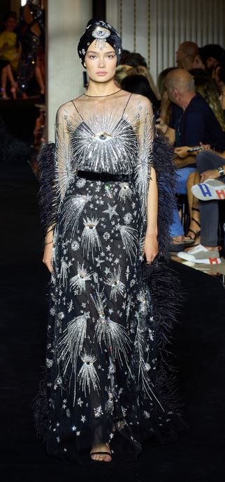 قدم زهير مراد لخريف 2022 مجموعة ساحرة من أجمل فساتين الكوتور والتي استوحاها من علم الفلك، فظهرت العارضات بقطع مزينة بتطريزات تعكس هذا النمط، أحببنا منها الفستان الأسود الطويل المحبوك بتطريز فضي على شكل النجوم المتلألئة والـEvil Eye تزين منتصف الصدر، وتتناثر على التنورة الـA Line، ولمزيد من التفرد اعتمرت العارضة القبعة، وقد ازدانت أيضاً بأكسسوار الـEvil Eye.