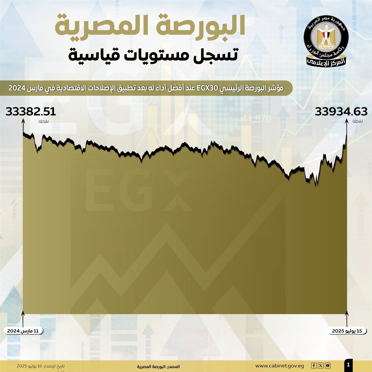 كشف تقرير صادر عن مجلس الوزراء أن  مؤشر البورصة الرئيسي سجل مستويات تاريخية مسجلًا نسبة ارتفاع 14.1% صعودًا، ليصل إلى مستوى 33934 نقطة ملامسًا مستوى 34000 نقطة، ومحققًا بذلك أعلى مستوى للبورصة.