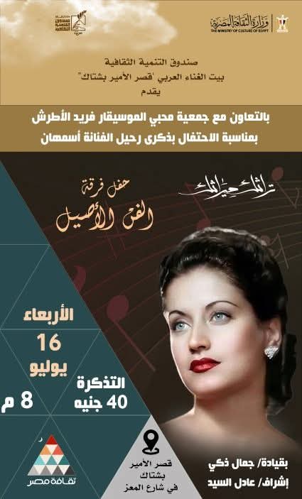 يقام الحفل في ذكرى رحيل الفنانة (أسمهان) بالتعاون مع جمعية محبى الموسيقار/ فريد الأطرش برئاسة عادل السيد.