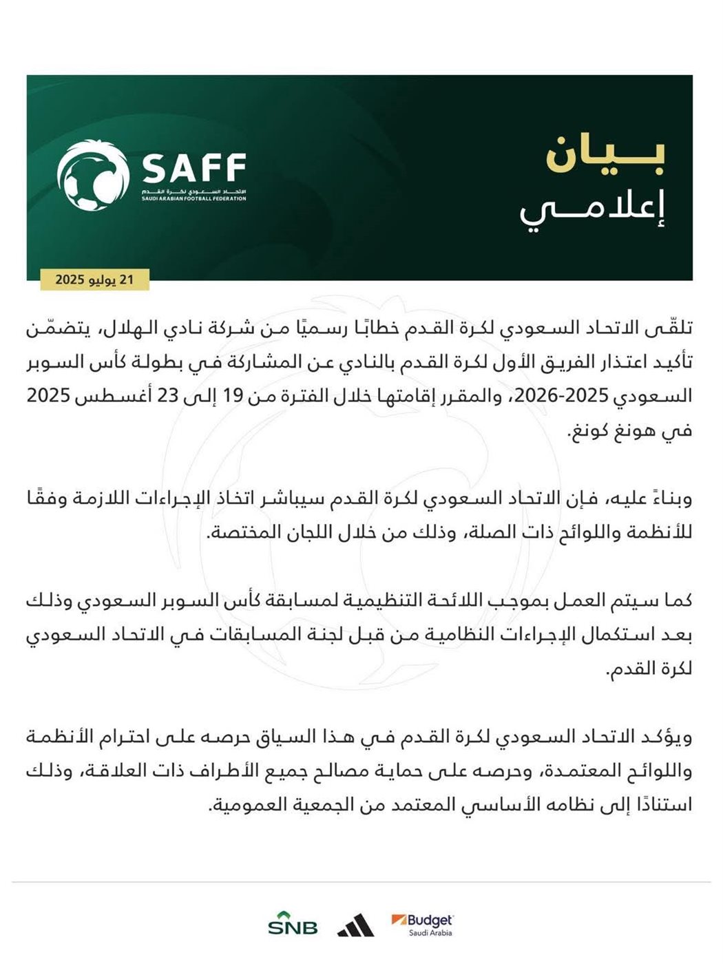 الهلال السعودي يعلن انسحابه رسميًا من كأس السوبر المحلي .. قرارات تأديبية منتظرة