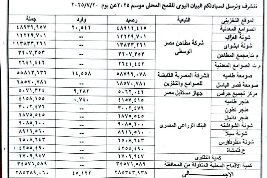 وكانت صوامع الغلال قد بدأت استلام محصول القمح من المزارعين منذ بداية شهر أبريل الماضي، بعدد من الشون والصوامع والهناجر المجهزة لاستقبال المحصول بالقرى والمراكز.
