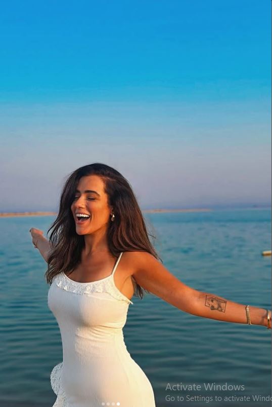 وأبرز الفستان قوامها المتناسق، ليمنحها حضورًا لافتًا في أجواء صيفية ناعمة.