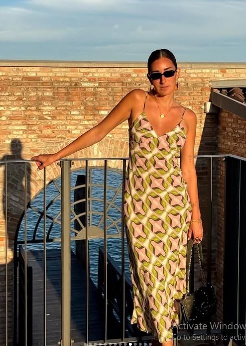 تميَّز الفستان بربطة جانبية عند الخصر، وياقة مستقيمة، وانسدل بطول متوسط يُبرز نعومة الإطلالة. نسقته مع صندل جلدي بلون بني، ونظارة شمسية سوداء، وأضافت لمسة عفوية بابتسامتها الواسعة وسط مباني فينيسيا التاريخية، في مشهد يوحي بالبساطة والرقي.