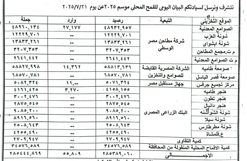توريد 285444 طن قمح للشون والصوامع والهناجر بالفيوم