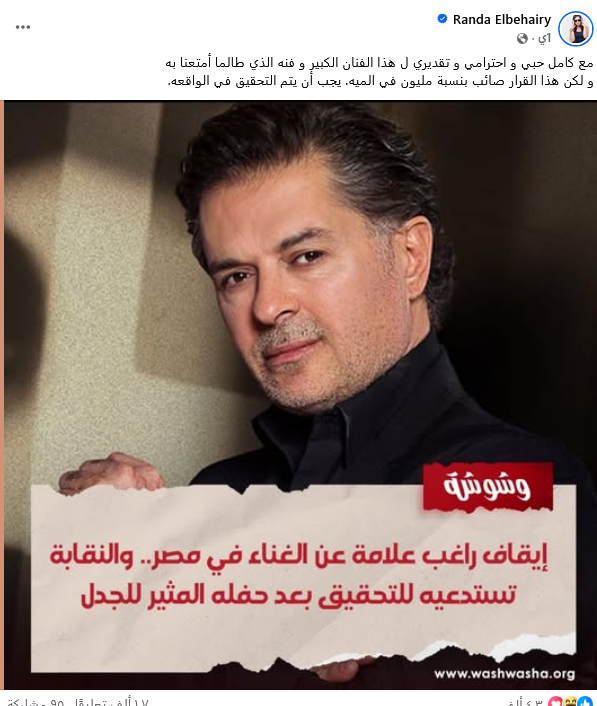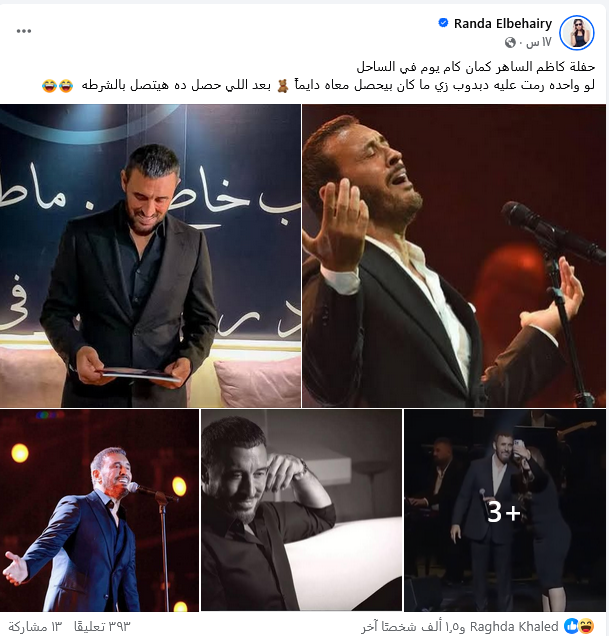 بعد أزمة النجم راغب علامة شاركت الفنانة راندا البحيري منشوراً عبر صفحتها الرسمية بموقع فيسبوك تمازح من خلاله جمهورها وذلك بمناسبة اقتراب حفلة كاظم الساهر في الساحل الشمالي.