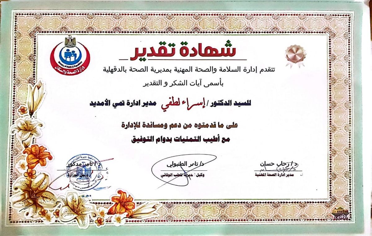 يأتي هذا التكريم تتويجًا لجهود الدكتورة إسراء لطفي المتميزة وحصولها على المركز الأول في مجال الصحة المهنية على مستوى المحافظة.