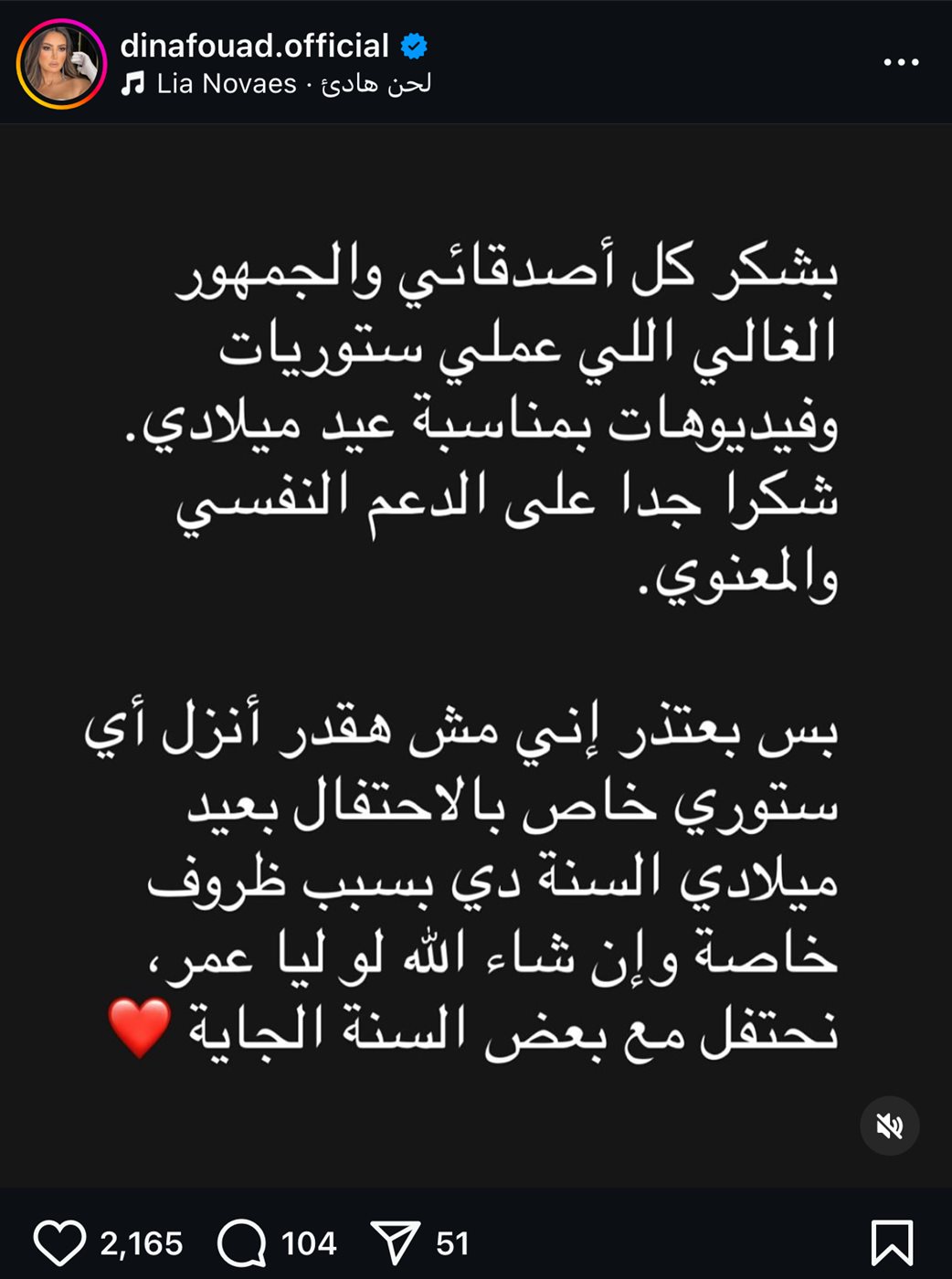 واختتمت معتذرة: "بس بعتذر إني مش هقدر أنزل أي ستوري خاص بالاحتفال بعيد ميلادي السنة دي بسبب ظروف خاصة وإن شاء اللّٰه لو ليا عمر، نحتفل مع بعض السنة الجاية".
