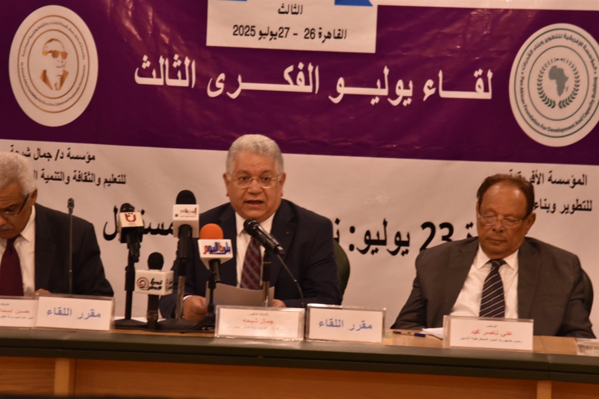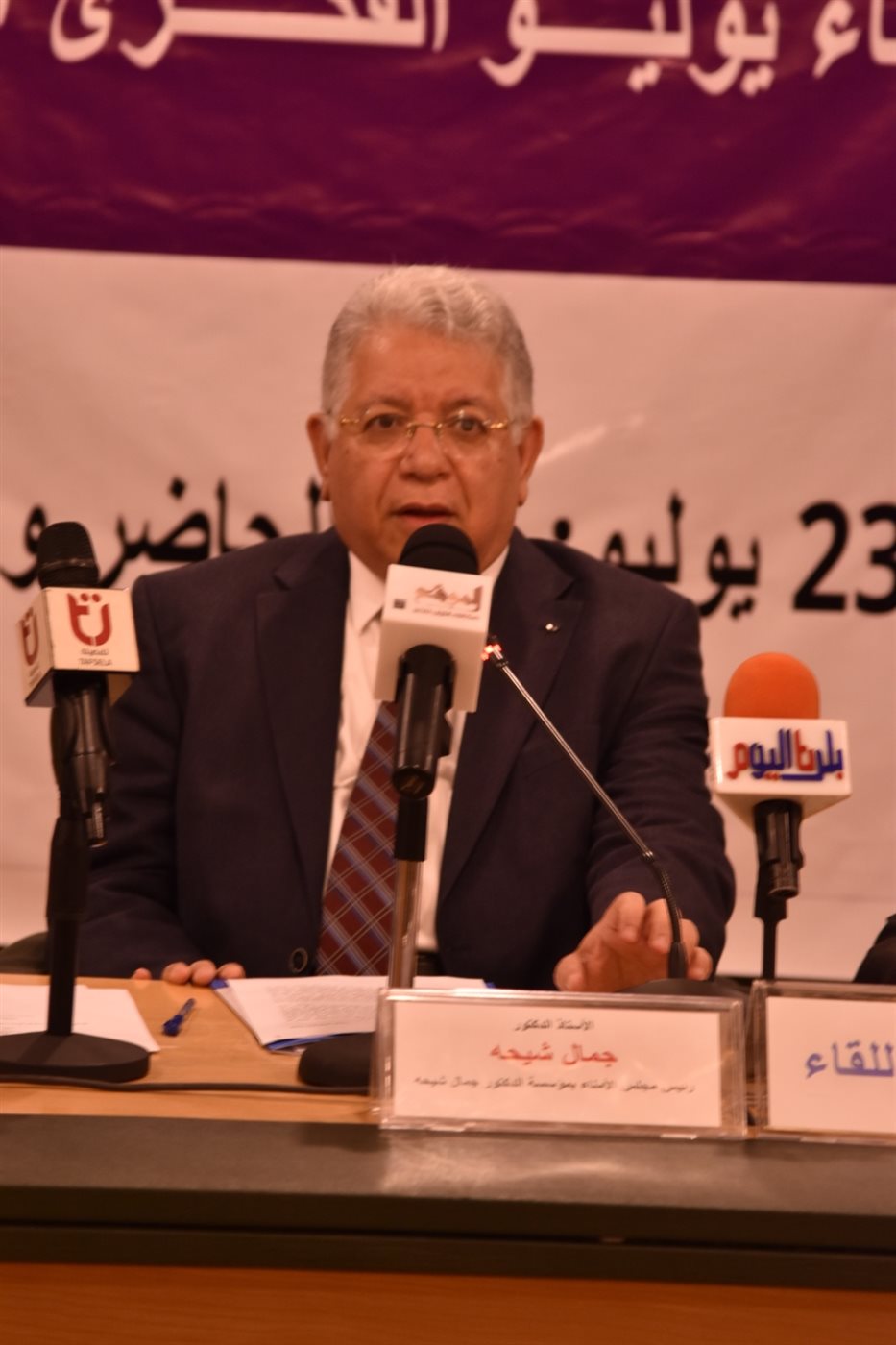 واختتم شيحة كلمته: "المشروع الصهيوني الأميركي يهيمن على المنطقة ونحن أبناء 23 يوليو نتساءل أين المشروع العربي المضاد للمشروع الصهيوني الأمريكي والبداية من النقد الذاتي في العراق سوريا ليبيا اليمن الجزائر لاستلهام التجربة لذا ندعو لمشروع جديد يتلافى أخطاء الماضي وهي مهمة شديد الصعوبة"، معبرا عن أمله أن يصبح لقاء يوليو الفكري يمكن أن يكون شعاع أمل يزداد قوة يوما بعد يوم لمواجهة المشروع الصهيوني الأميركي.