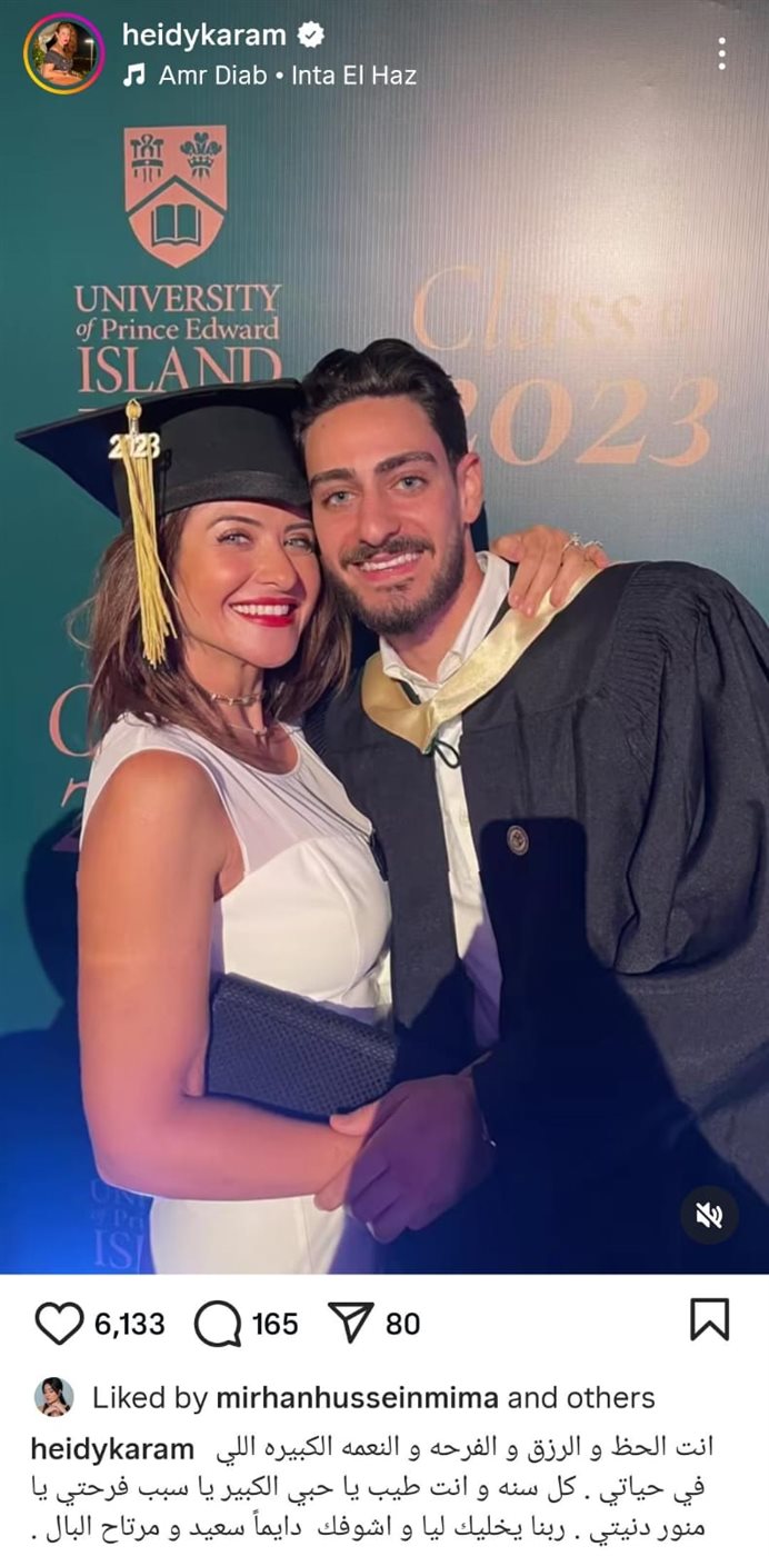 وثقت هيدي كرم في الفيديو الذي شاركته، الكثير من اللقطات والصور العائلية الدافئة التي تجمعها بنجلها، مرفقةً إياها بأغنية "أنت الحظ" للفنان عمرو دياب، في خلفية عاطفية مليئة بالحب والفخر.