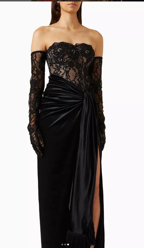 وبدت دينا الشربيني بإطلالة عصرية، مواكبة لأحدث صيحات موضة فساتين صيف 2025، مرتديه فستان قصير من الأمام وطويل من الخلف، ينتمي لقصه الكب، صمم من قماش الدانتيل الممزوج من المخمل باللون الأسود، استغنت عن الأكمام المنفصله لتظهر من غيره.