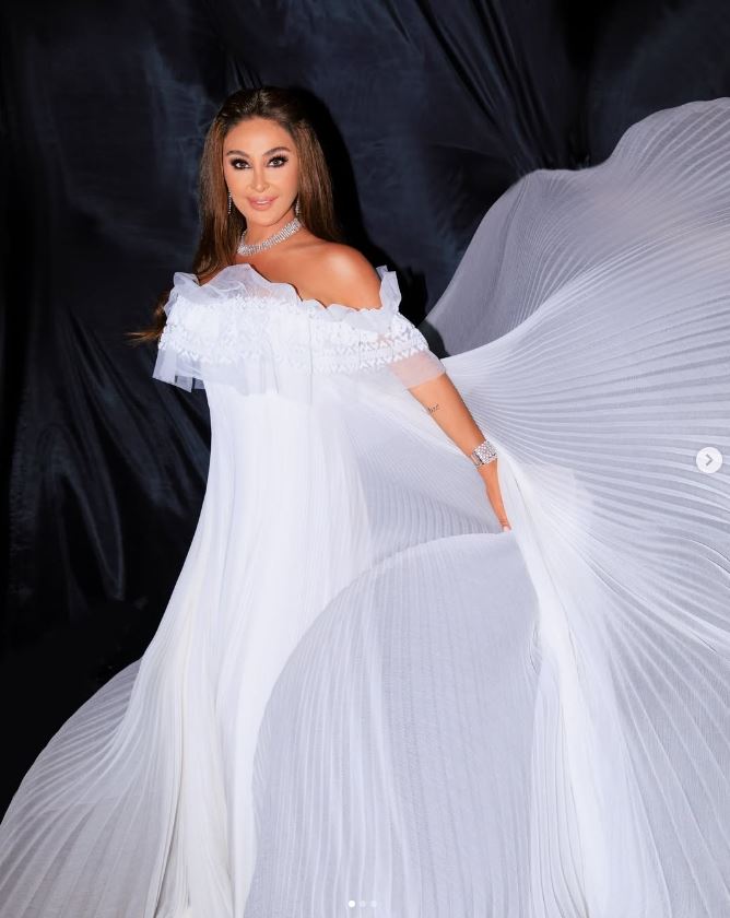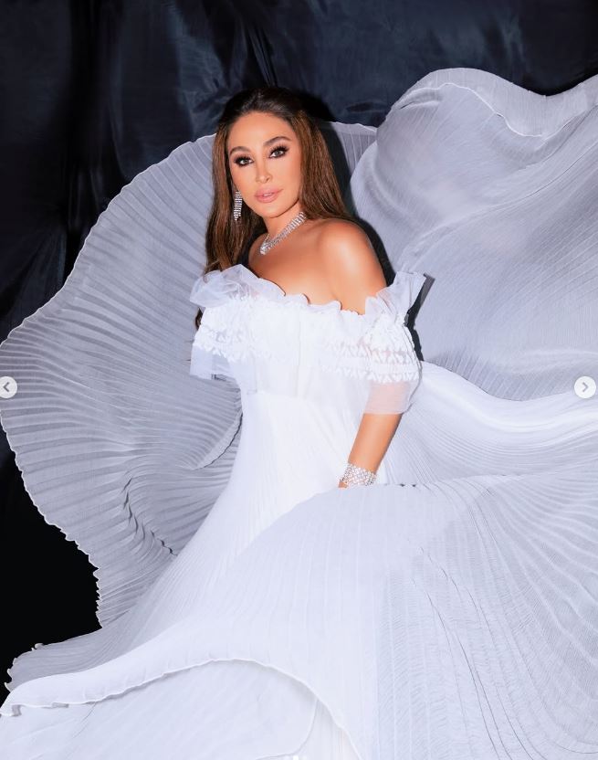 وبدت إليسا بإطلالة جذابة مفعمة بالأناقة والرقي باللون الأبيض، حيث ارتدت فستانًا طويلًا فضفاضًا، ينتمي لقصة الأوف شولدر، صمم من قماش الحرير لتشبه الفراشة.