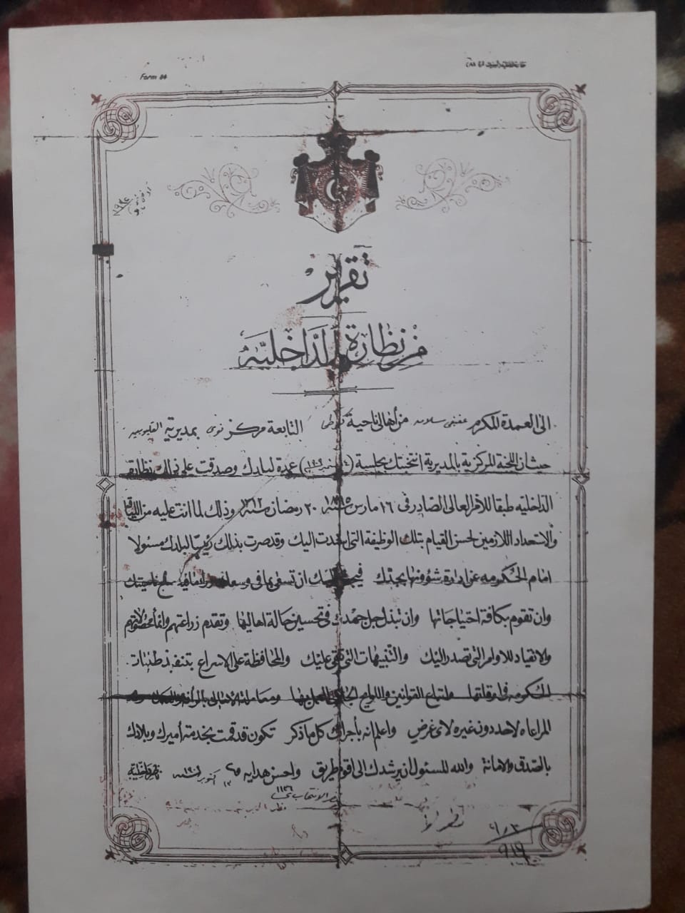الوثيقة صادرة في 13 أكتوبر 1909عن نظارة الداخلية ( وزارة الداخلية حاليا) ، وتحمل عنوان" تقرير من نظارة الداخلية" وموجهة إلى العمدة المكرم "عفيفي سلامة" من أهالي قرية كفر طحا التابعة لمركز نوى ( وهي حاليا تابعة لمركز شبين القناطر ) بمديرية القليوبية.