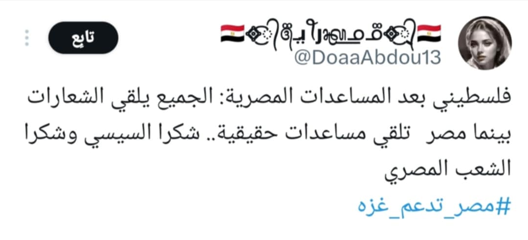 ودون حساب بإسم “دعاء عبدو” “فلسطيني بعد المساعدات المصرية: الجميع يلقي الشعارات بينما مصر تلقي مساعدات حقيقية.. شكرا السيسي وشكرا الشعب المصري”.