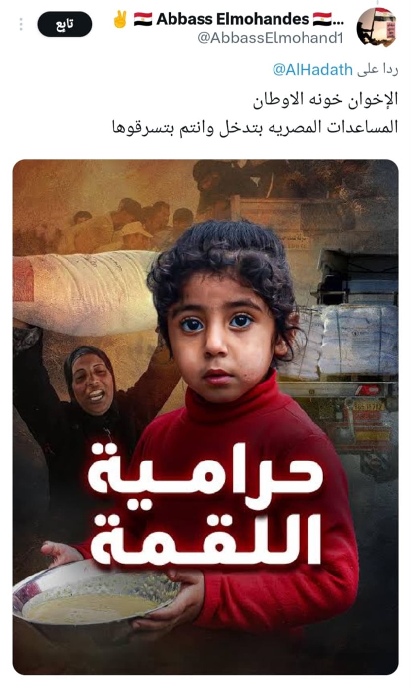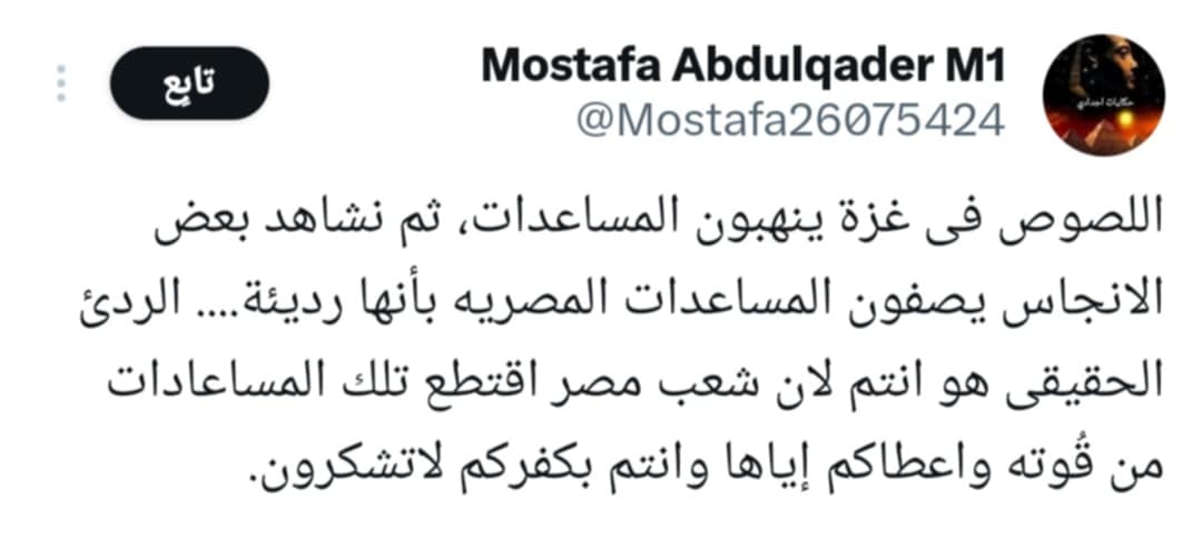 فيما دون حساب أخر بإسم مصطفى عبد القادر “اللصوص في غزة ينهبون المساعدات، ثم نشاهد بعض الانجاس يصفون المساعدات المصريه بأنها رديئة…. الردئ الحقيقي هو انتم لان شعب مصر اقتطع تلك المساعدات من قوته واعطاكم اياها وانتم بكفركم لا تشكرون”.