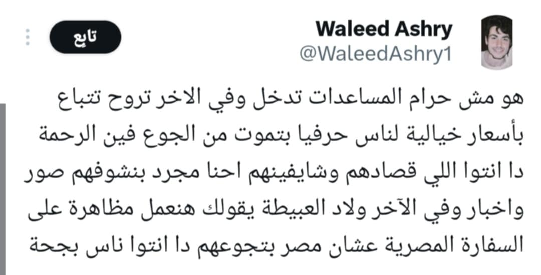 فيما انتقد حساب بإسم وليد عشري الحملات التحريضية على التظاهر أمام السفارات المصرية وبيع المساعدات التي يتم ادخالها بأسعار مرتفعة في ظل موت البعض من الجوع كاتبًا “ هو مش حرام المساعدات تدخل وفي الاخر تروح تتباع بأسعار خيالية لناس حرفيا بتموت من الجوع فين الرحمة دا انتوا اللي قصادهم وشايفينهم احنا مجرد بنشوفهم صور واخبار وفي الاخر ولد العبيطة يقولك هنعمل مظاهرة على السفارة المصرية عشان مصر بتجوعهم دا انتوا ناس بجحة”