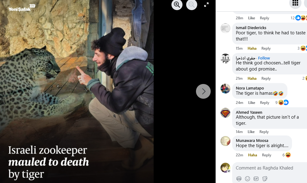 وأثار الحادث موجة من التعليقات عبر مواقع التواصل الاجتماعي حيث سخر الرواد من الحادث واهنالوا بمحاولات الاطمئنان على النمر والسؤال حول حالة جهازه الهضمي بعد الوجبة التي تناولها كما سأل آخرون من عدد من دول العالم عما إذا كانت وسائل الإعلام الإسرائيلية سيخرج مؤكدة أن النمر يتبع حركة حماس أم لا.