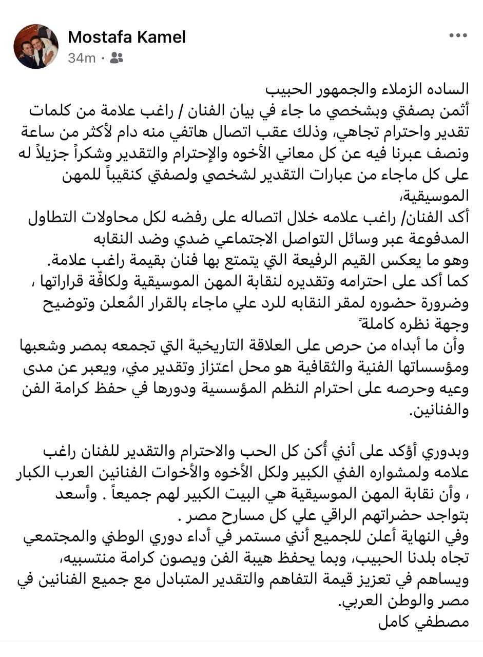 أعرب الفنان مصطفى كامل، نقيب المهن الموسيقية، عن خالص تقديره لما جاء في بيان الفنان راغب علامة من كلمات احترام وتقدير لشخصه وصفته كنقيب، مؤكدًا أن الاتصال الهاتفي المطول الذي جمعهما، والذي دام لأكثر من ساعة ونصف، عبّر فيه الطرفان عن معاني الأخوة والاحترام المتبادل.