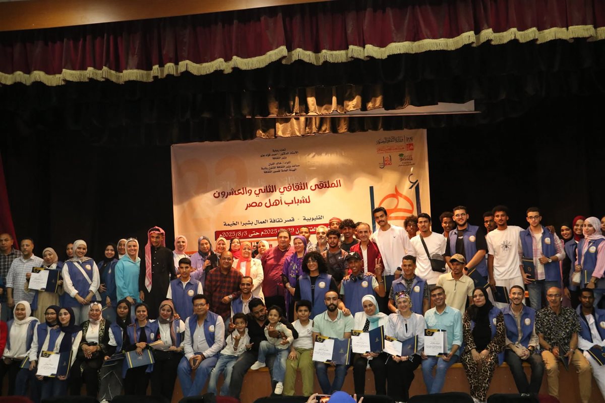شهد قصر ثقافة العمال بشبرا الخيمة، حفل ختام الملتقى الثقافي الثاني والعشرين لشباب المحافظات الحدودية، ضمن مشروع "أهل مصر"، الذي أقيم برعاية الدكتور أحمد فؤاد هنو وزير الثقافة، ونظمته الهيئة العامة لقصور الثقافة، برئاسة اللواء خالد اللبان، تحت شعار "يهمنا الإنسان"،