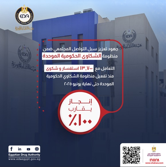 أعلنت هيئة الدواء المصرية أنها تعاملت بكفاءة عالية مع ما يقرب من 13,700 استفسار وشكوى منذ تفعيل منظومة الشكاوى الحكومية الموحدة التابعة لرئاسة مجلس الوزراء وحتى نهاية يونيو 2025، محققة نسبة إنجاز تقترب من 100%، وذلك في إطار تعزيز مبدأ الشفافية بما يعزز ثقة المواطنين ويحقق رضاهم عن جودة الخدمات المقدمة.